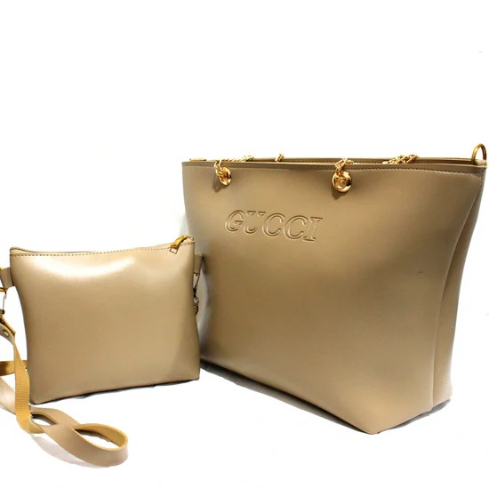Elegant gold-toned leather tote set featuring embossed “GUCCI” lettering, paired with a matching mini shoulder pouch. Both bags have gold hardware and sleek zip closures for a luxe, versatile look.